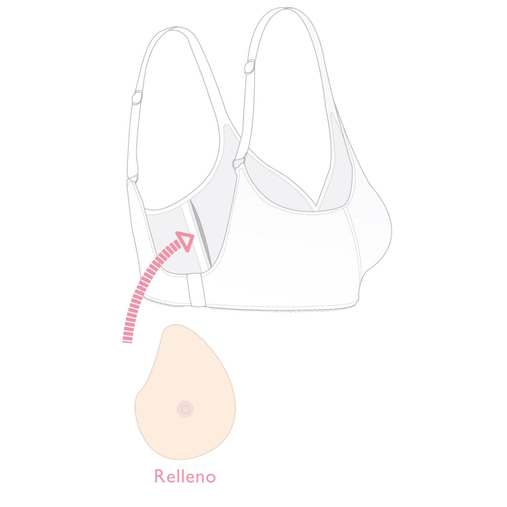 Brasier sin aros, copas sin realce con refuerzo de espuma en el contorno interno. Banda media y con elástico para un mejor ajuste. Broche de dos ganchos y tres niveles de ajuste, tirantes regulables. Elaborado de algodón elastano. Cuenta con una abertura en copas para introducir prótesis de post-mastectomía. *Prótesis no incluidas.
