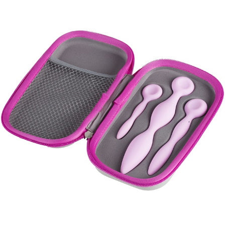 Intimrelax está indicado para el tratamiento de la vaginitis atrófica o atrofia vaginal con dificultades de penetración. Es un sistema de reeducación con 3 dildos ergonómicos intravaginales, fabricados en silicona 100% médica y presentados en diferentes tallas y diámetros para ejercitar y dilatar de forma progresiva el canal vaginal. Está ideado como un programa de ejercicios diarios dirigidos a recuperar plenamente la cavidad y elasticidad vaginal, paliar la dispaurenia (dolor coital) y consecuentemente perder el miedo a la penetración. Se recomienda utilizar con lubricante de base acuosa. Se trata de una solución para recuperar y gozar de una vida sexual plena, sana e indolora. Dilatador S: 9,5 cm. de longitud total (6,5 cm. insertables) x 0,9 cm. de diámetro máximo. Dilatador M: 12,5 cm. de longitud total (9,5 cm. insertables) x 1,5 cm. de diámetro máximo. Dilatador L: 16 cm. de longitud total (13 cm. insertables) x 2,5 cm. de diámetro máximo. Color: Rosa palo. Material: Silicona. Incluye un práctico estuche para guardarlos.