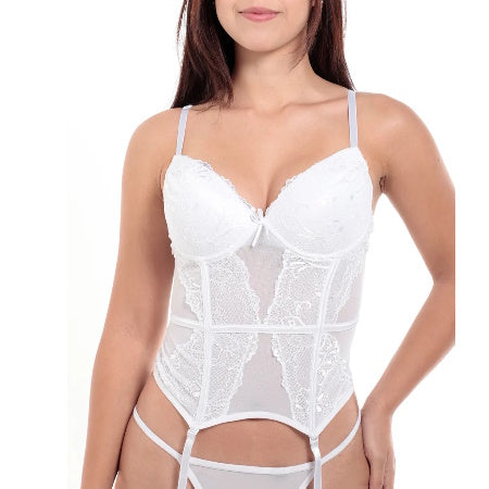 ¡Siéntete segura y sensual con nuestro conjunto bustier y tanga! Con detalles encaje que aportan un toque sutil y elegante, este conjunto es perfecto para lucir en cualquier ocasión especial. combínalo con nuestras medias de liguero.