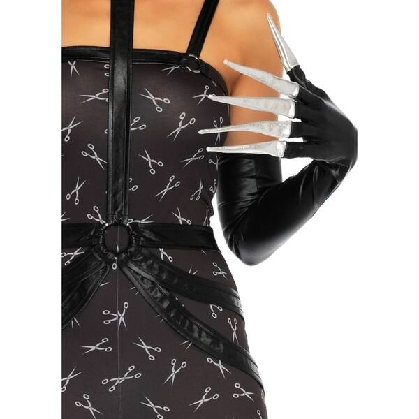 El traje Sweetie de Scissor Creepy viene con un arnés al cuello halter y guantes largos de cuero con las extremidades de los dedos de la lámina y body.